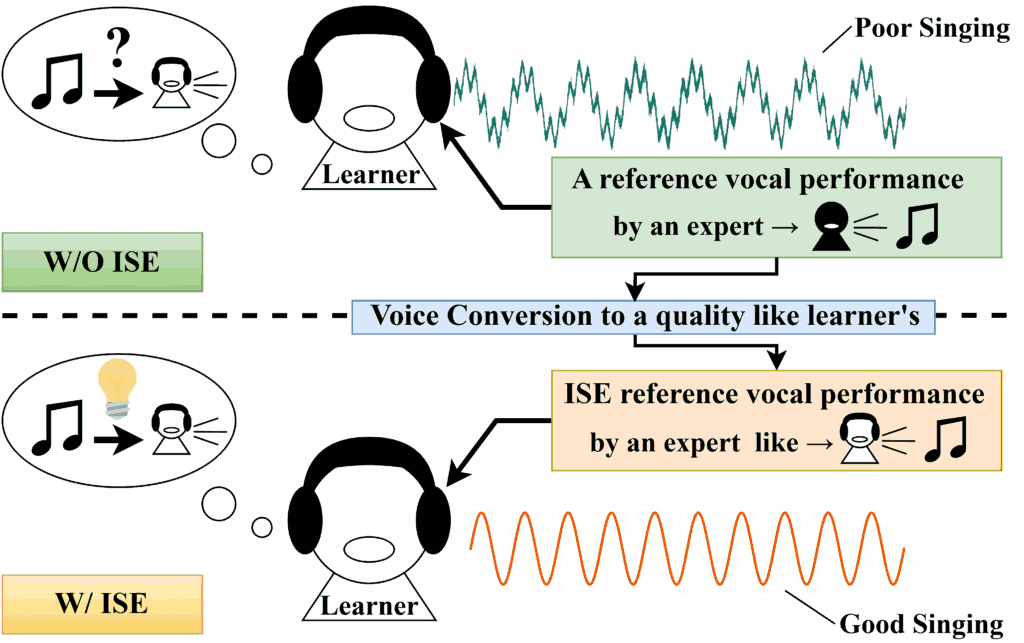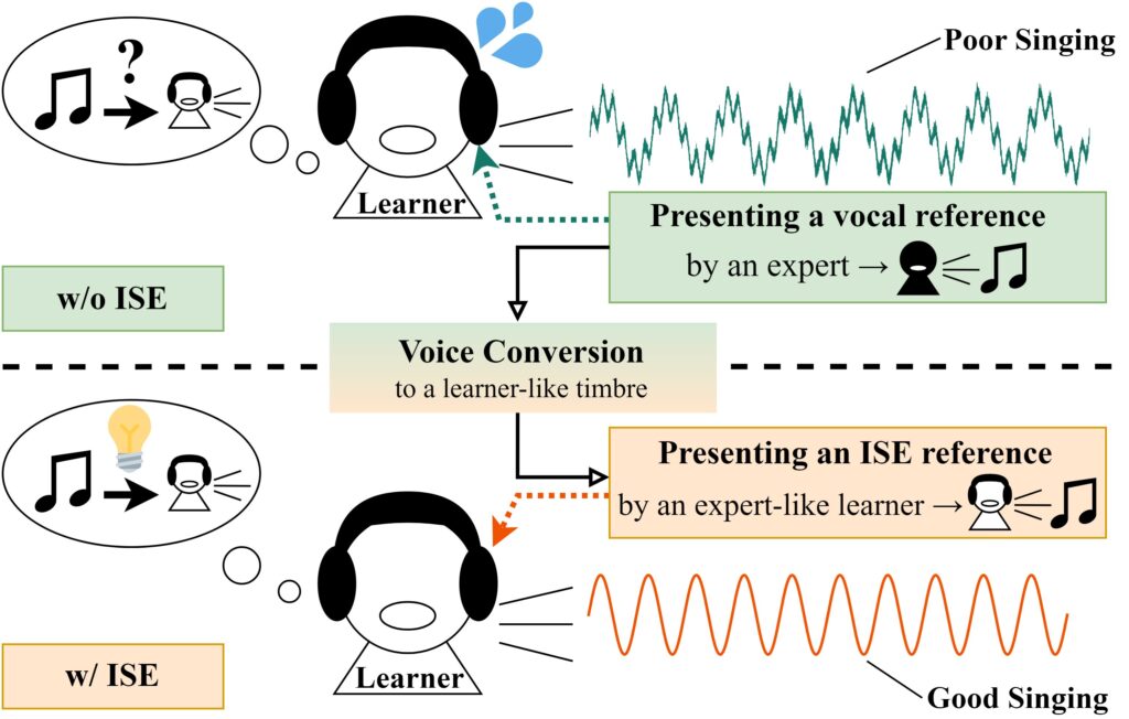 Ideal Self Emulation(ISE)の概要図:原曲のお手本では発声動作をイメージしずらい一方で、ISEは上手い自分の歌唱をお手本とするので発声がイメージしやすいことを示している。