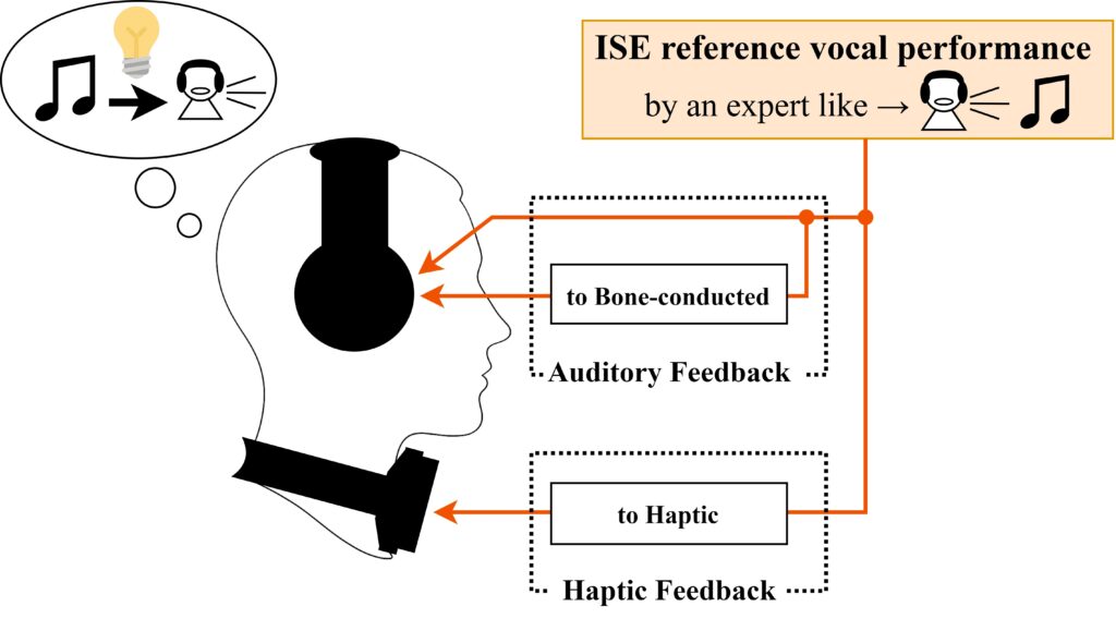 そこで本研究ではIdeal Self Emulation(ISE)を提案します。ISEは、熟練者の理想的な歌唱パターンを学習者自身の声質に変換し、リファレンス(お手本)として提示するフィードバック手法です。本研究の最終的な目標は、マルチモーダル歌唱熟達支援システムの構築です。具体的には、ISEによる聴覚フィードバックに加えて、骨伝導や喉頭部振動刺激といった触覚フィードバックを統合することで、不可視タスクである歌唱の熟達を効果的に支援します。