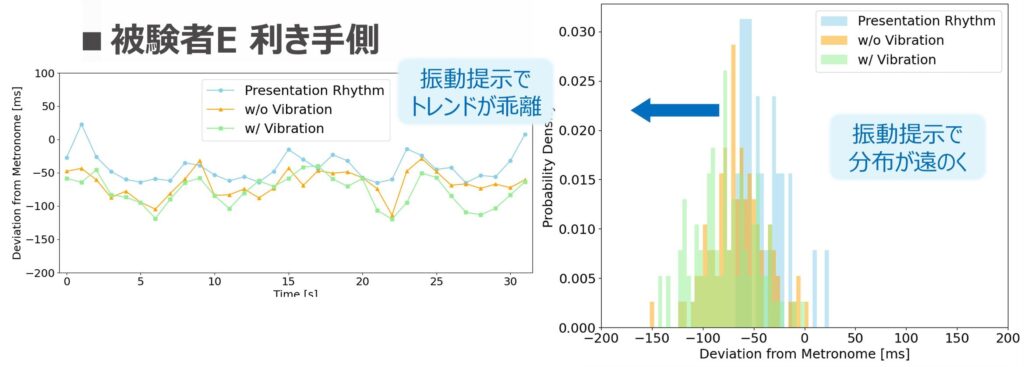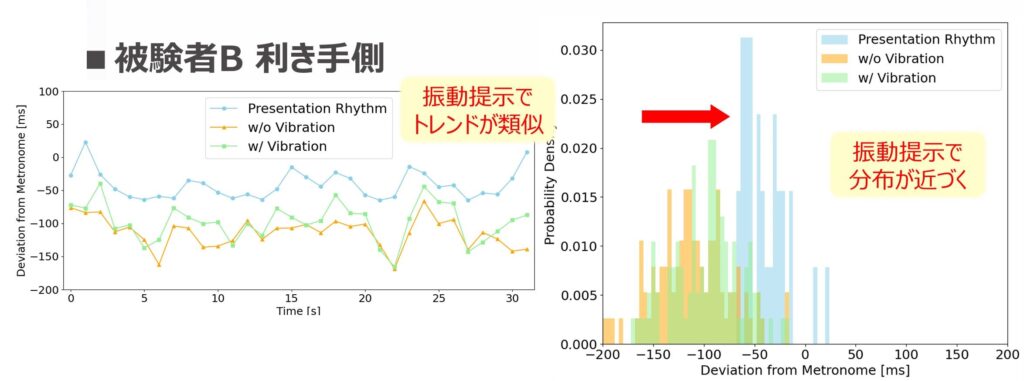 被験者によって振動提示の影響に差が発生した原因として,被験者によって「リズムの取り方(リズム入出力に関する内部モデル)」に個人差が存在する可能性が考えられる.このことから,振動刺激を用いてグルーヴ感を伝達するためには,振動刺激を適切に処理できる内部モデルの構築が必要であると考えられる.