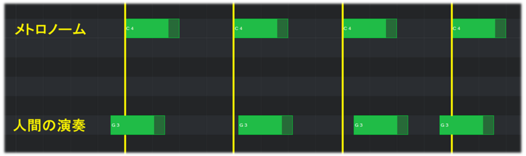 人間がメトロノームに合わせてリズムを演奏する際,人間のリズムとメトロノームのリズムとの間に微小なタイミングのズレが発生する.熟練した演奏者のズレは「グルーヴ感」と呼ばれ,音楽のノリや一体感を表す指標として用いられている.