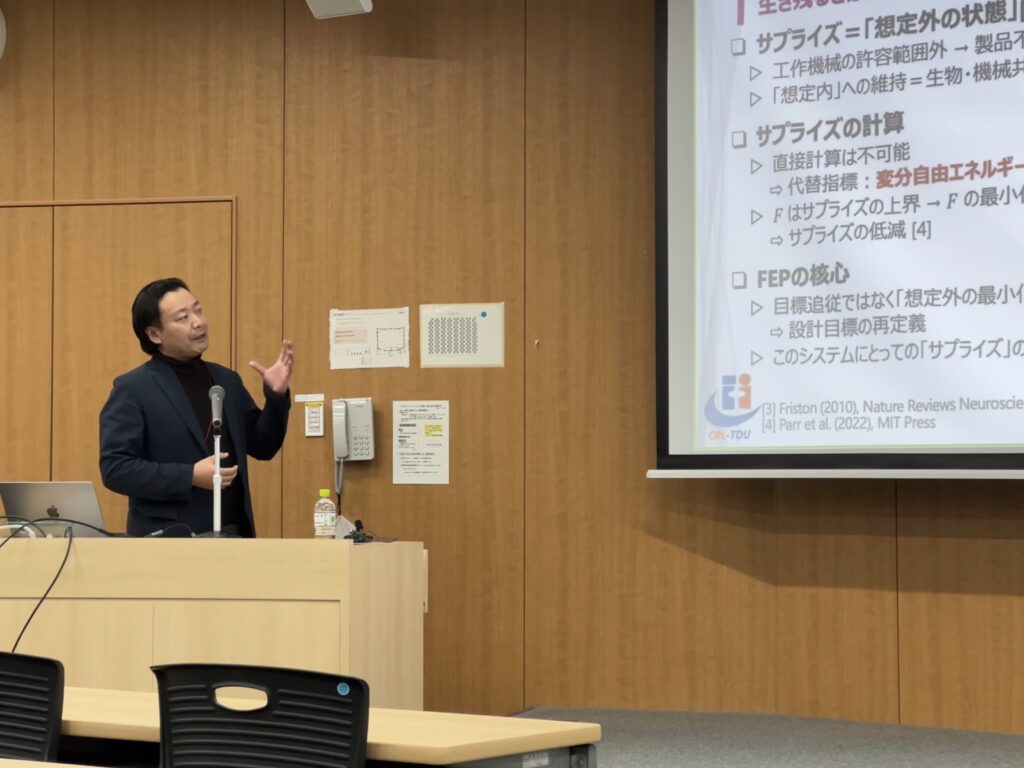 「自由エネルギー原理とアクティブ・インファレンスによる人間機械協調の深化 ー新たなヒューマン・インタフェースの設計論ー」- 本講演では、人と機械が「操作者と道具」という関係を超え、互いに意図を汲み取る「阿吽の呼吸」を実現するための新しいアプローチについて解説しました。従来のAIでは困難だった人間の曖昧な意図や揺らぎの理解を、脳神経科学の知見である「自由エネルギー原理」を用いて機械に実装する「計算論的共感」の実現方法を紹介しました。機械が人間の状態を推測し、状況に応じて情報の重要度を柔軟に調整することで、人間がより自然に感じる次世代インタフェースの設計指針を提案する内容で講演を行いました。